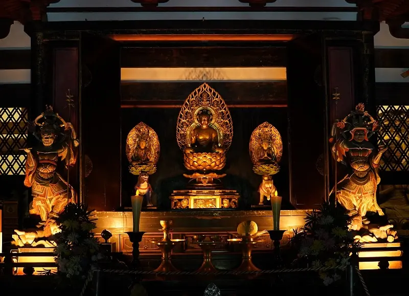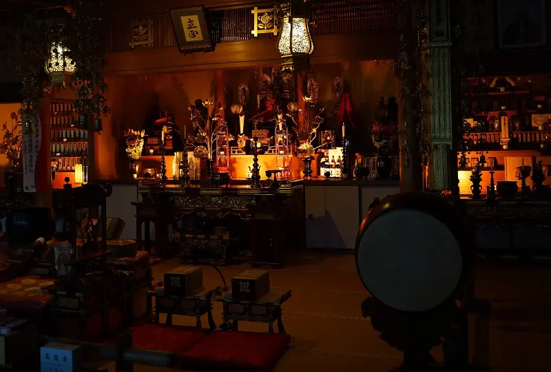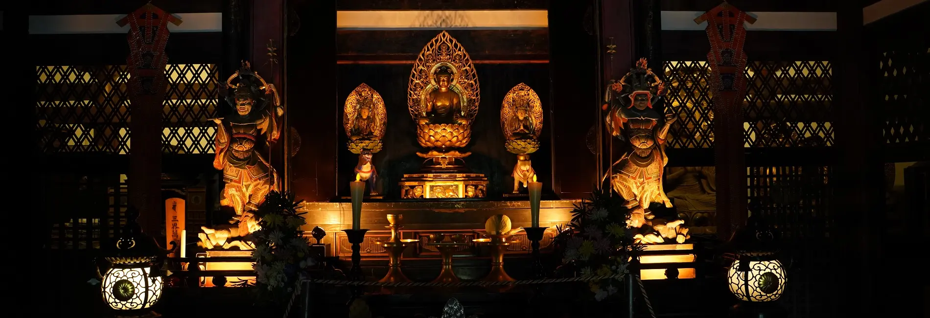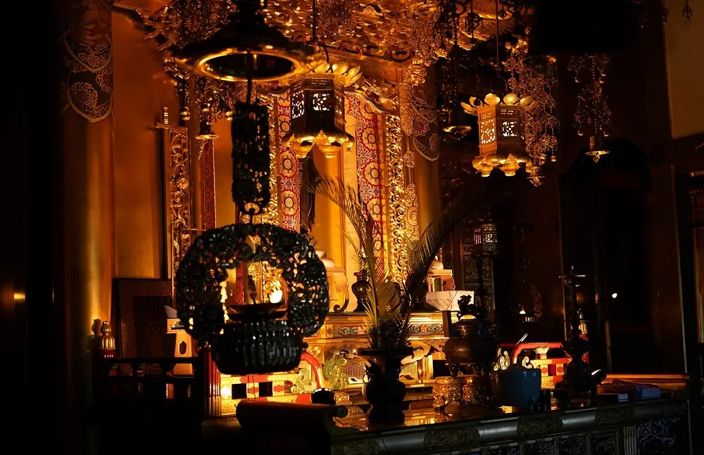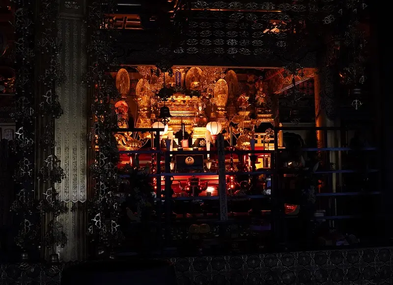 炎に似た光が金箔や仏具を映し出す。静寂と荘厳が調和する内陣照明。