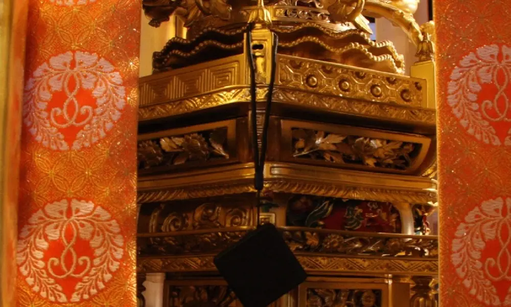 内陣照明は、一般的な電球色よりも、ろうそくの炎に近い色合いで発光する照明です。やわらかく落ち着いた光で、内陣にふさわしい荘厳な雰囲気を演出します。