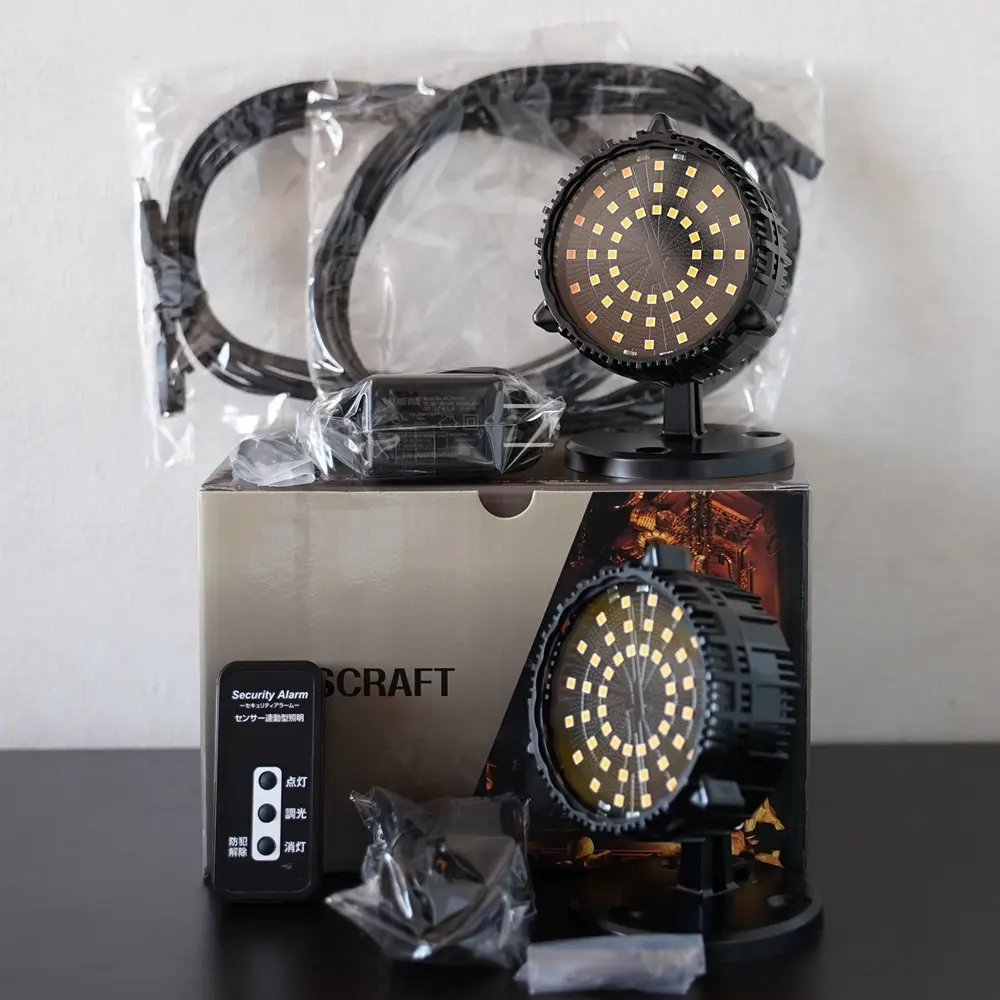 センサー連動型の内陣照明2台に加え、調光リモコン、専用延長ケーブル、壁付け用ビスを同梱した電気工事が要らない簡単設置の照明キットです。導入後すぐに設置しやすい構成となっており、寺院空間に合わせて置き型・壁固定の両方に対応できます。