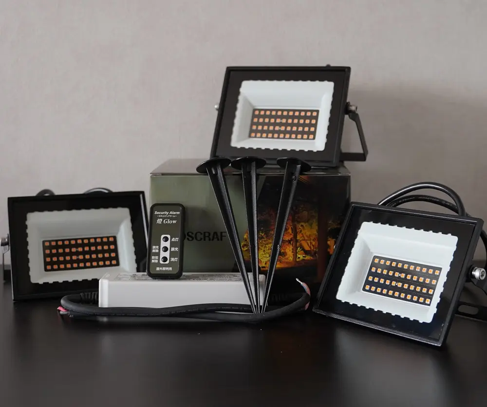 燈グロー照明3台に加え、調光リモコン、専用電源、グランドスパイクを同梱した屋外対応キットです。設置に必要な主要部材をまとめて揃えています。なお、本製品の設置には配線連結などの電気工事が必要となるため、お取引のある電気工事業者へご相談ください。