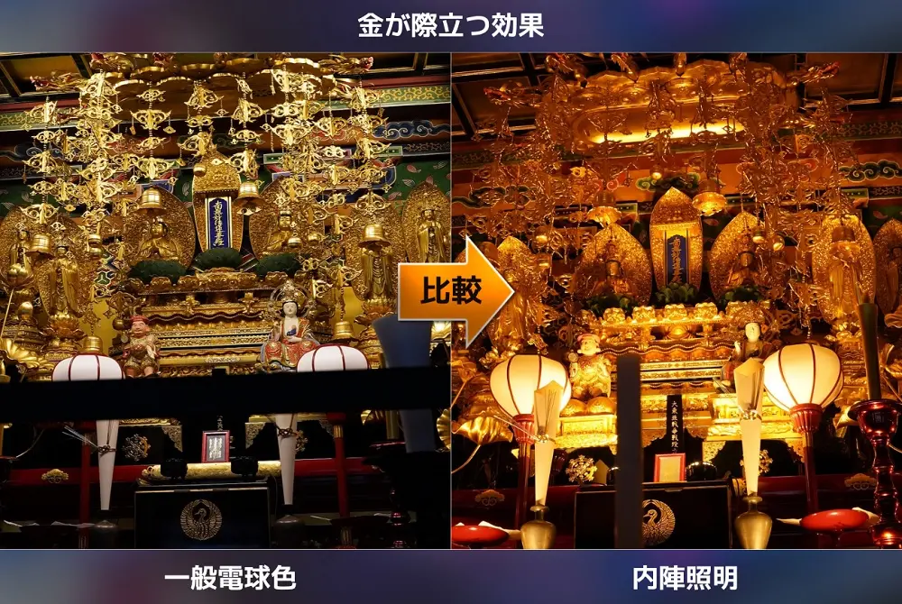 ロウソクの炎を思わせる、やわらかく温かな光で内陣を照らします。一般的なLEDにはない落ち着いた色味が、金箔や仏具の美しさをよりいっそう引き立て、荘厳でやさしい雰囲気を演出します。
